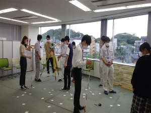 測量現場で実際に使っている最新機器で、測量を体験していただきました。その後、測量データに基づいてCAD図面を作成していく過程を見学してもらい、測量の果たす役割や意義を実感していただきました。