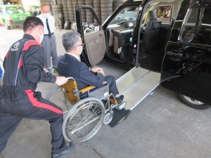 地域の交通を支えるタクシー会社にて、社内の整備場を見学。タクシー運転席への乗車体験では、サイドミラーや一時停止ボタンの配置など、一般車とは異なるプロ仕様の設計とその理由を解説していただきました。また、車椅子のまま乗車できるユニバーサルデザイン車両(UDタクシー)の仕組みも実演いただき、すべてのお客様に安全・快適な移動を提供する工夫とホスピタリティを学びました。